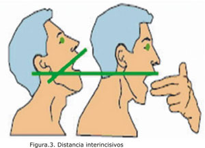 Distancia interincisivos (Figura 3): Distancia existente entre los incisivos superiores e inferiores, con la boca completamente abierta. Si el paciente presenta adoncia se medirá la distancia entre la encía superior e inferior a nivel de la línea media. Clase I: más de 3 cm, Clase II: 2,6 a 3 cm, Clase III: de 2 a 2,5 cm, Clase IV: menos de 2 cm.