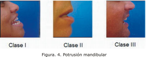 Protrusión mandibular (Figura 4): Se lleva el mentón lo más adelante posible. Clase I: los incisivos inferiores pueden ser llevados más delante de la arcada dentaria superior, Clase II: los incisivos inferiores se deslizan hasta el nivel de la dentadura superior, es decir, quedan a la misma altura, Clase III: los incisivos inferiores no se proyectan hacia adelante y no pueden tocar la arcada dentaria superior.