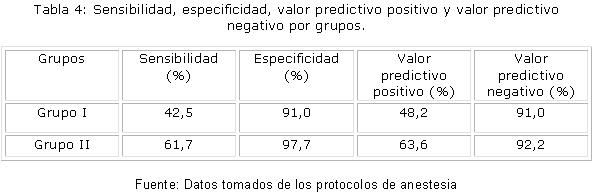 La mayor sensibilidad la tuvo el grupo II, así como también especificidad, valor predictivo positivo y negativo respectivamente. Ríos García 10 demostró que la mayor sensibilidad se registró en el grupo al que sólo se le realizó el Mallampati, así como las más específicas y de mayor valor pronóstico fueron cuatro pruebas predictivas agrupadas (distancia tiromentoniana, extensión de la articulación atlanto-occipital, distancia esternomentoniana, y distancia interincisivos) que en conjunto hacen una valoración pronóstica más adecuada.
